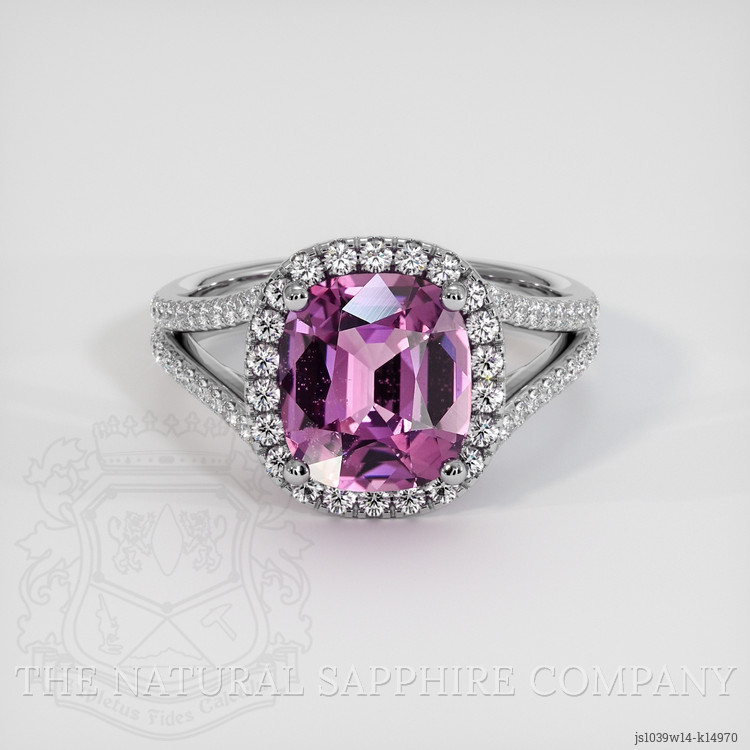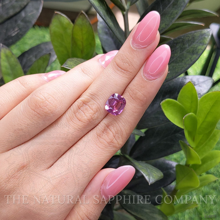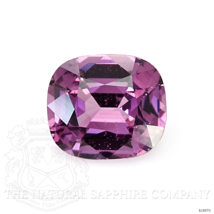 The centerpiece of this exquisite ring from The Natural Gemstone Company is a rare and captivating 4.02 carat cushion-shaped spinel, sourced from South Africa. Presenting a unique pinkish purple hue, this gemstone measures 10.41 x 9.20 x 5.49 mm and boasts a mixed brilliant cut, expertly crafted to enhance its natural beauty and allow maximum light to interplay. This spinel features an intense color saturation complemented by its very slightly included clarity, all working harmoniously to create an eye-catching brilliance. Enhanced through heat treatment, this gem presents an unsurpassed polish that amplifies its inherent vibrancy, making it a standout piece in any jewelry collection.