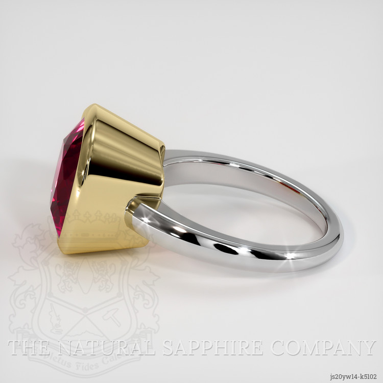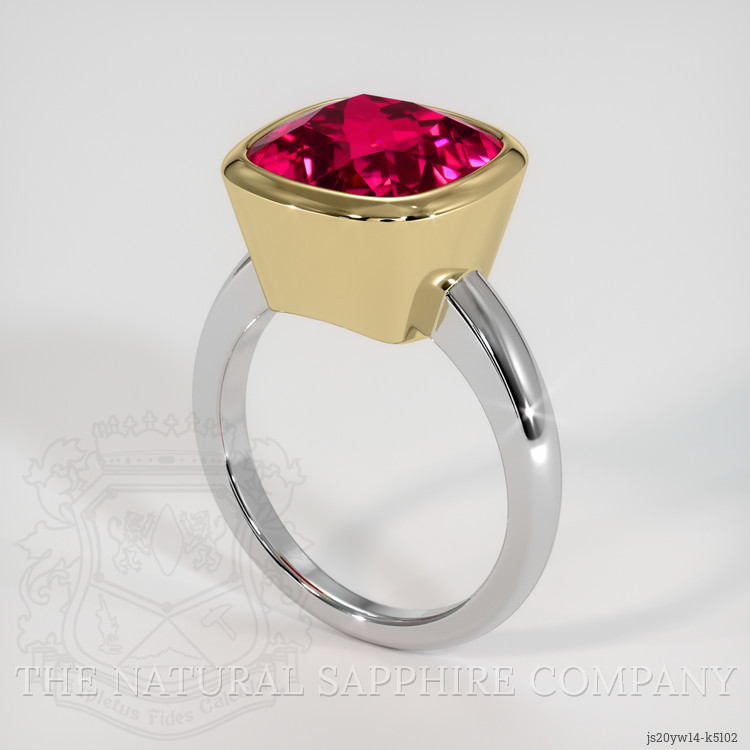 The men's ring features a beautiful, transparent, 6.87 carat cushion shape pinkish red rubellite tourmaline with the dimensions of 11.28 x 11.27 x 8.61 mm and a mixed brilliant cut. It has a clarity grade of eye clean (evaluated at eye level), vivid color saturation, and an excellent polish. The origin of this rubellite tourmaline is Brazil. This rubellite tourmaline, with its hypnotizing pinkish red hue, has a remarkable presence that is further enhanced by its classic mixed brilliant cut. This cut, meticulously crafted, ensures that the gem reflects light in the most enchanting manner, amplifying its stunning color and inherent brilliance. The eye clean clarity means that no inclusions are visible to the naked eye, presenting a pristine clarity that is highly sought after by gem connoisseurs. The vivid color saturation indicates a rich and intense color, adding to the gemstone's mesmerism and allure. Brazil, the country of origin for this rubellite tourmaline, is renowned for producing some of the world's finest colored gemstones. The rich history and geology of Brazil contribute to the unique beauty of this rubellite tourmaline, making it an exceptional choice for an exquisite piece of jewelry. The metalwork of the ring is equally important in its construction. The band is meticulously crafted from a combination of 18K yellow gold and 18K white gold, showcasing expert craftsmanship and an eye for detail. The 18K yellow gold setting creates a warm, radiant frame for the rubellite tourmaline, while the 18K white gold band imparts a contemporary appeal and contrast, ensuring the ring stands out as a modern masterpiece. This exquisite men's ring is not just a testament to fine jewelry craftsmanship but also a celebration of the unique beauty and rich history of rubellite tourmaline. It is an investment piece that will hold its value over time and bring immense joy and admiration to its owner. For the educated buyer, this ring represents the epitome of luxury, rarity, and timeless elegance, making it an invaluable addition to any fine jewelry collection.