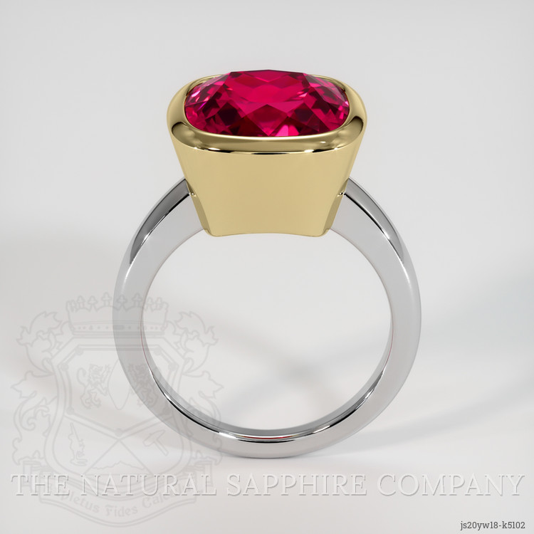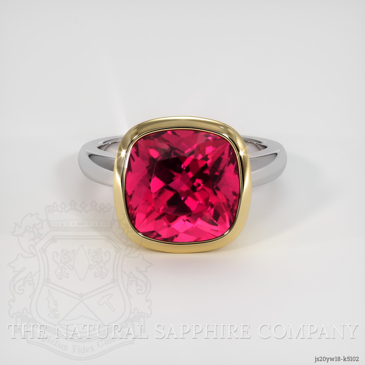 The men's ring features a beautiful, transparent, 6.87 carat cushion shape pinkish red rubellite tourmaline with the dimensions of 11.28 x 11.27 x 8.61 mm and a mixed brilliant cut. It has a clarity grade of eye clean (evaluated at eye level), vivid color saturation, and an excellent polish. The origin of this rubellite tourmaline is Brazil. This rubellite tourmaline, with its hypnotizing pinkish red hue, has a remarkable presence that is further enhanced by its classic mixed brilliant cut. This cut, meticulously crafted, ensures that the gem reflects light in the most enchanting manner, amplifying its stunning color and inherent brilliance. The eye clean clarity means that no inclusions are visible to the naked eye, presenting a pristine clarity that is highly sought after by gem connoisseurs. The vivid color saturation indicates a rich and intense color, adding to the gemstone's mesmerism and allure. Brazil, the country of origin for this rubellite tourmaline, is renowned for producing some of the world's finest colored gemstones. The rich history and geology of Brazil contribute to the unique beauty of this rubellite tourmaline, making it an exceptional choice for an exquisite piece of jewelry. The metalwork of the ring is equally important in its construction. The band is meticulously crafted from a combination of 18K yellow gold and 18K white gold, showcasing expert craftsmanship and an eye for detail. The 18K yellow gold setting creates a warm, radiant frame for the rubellite tourmaline, while the 18K white gold band imparts a contemporary appeal and contrast, ensuring the ring stands out as a modern masterpiece. This exquisite men's ring is not just a testament to fine jewelry craftsmanship but also a celebration of the unique beauty and rich history of rubellite tourmaline. It is an investment piece that will hold its value over time and bring immense joy and admiration to its owner. For the educated buyer, this ring represents the epitome of luxury, rarity, and timeless elegance, making it an invaluable addition to any fine jewelry collection.