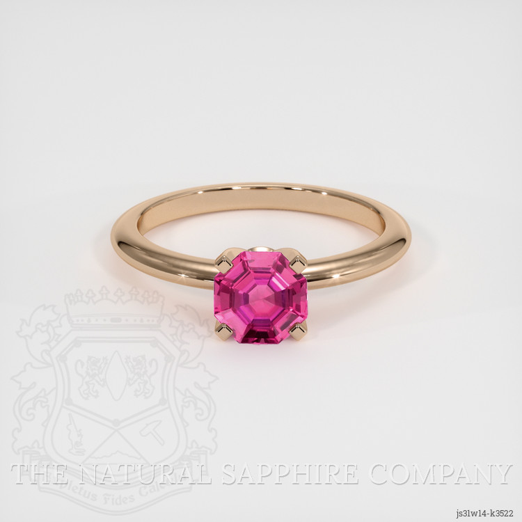 The ring features a beautiful, transparent 0.81 carat fancy shape pinkish red rubellitetourmaline with the dimensions of 6.42 x 6.41 x 3.70 mm and a step cut. It has a clarity grade of very slightly included (evaluated at eye level), intense color saturation, and an excellent polish. The origin of this rubellitetourmaline is Brazil.