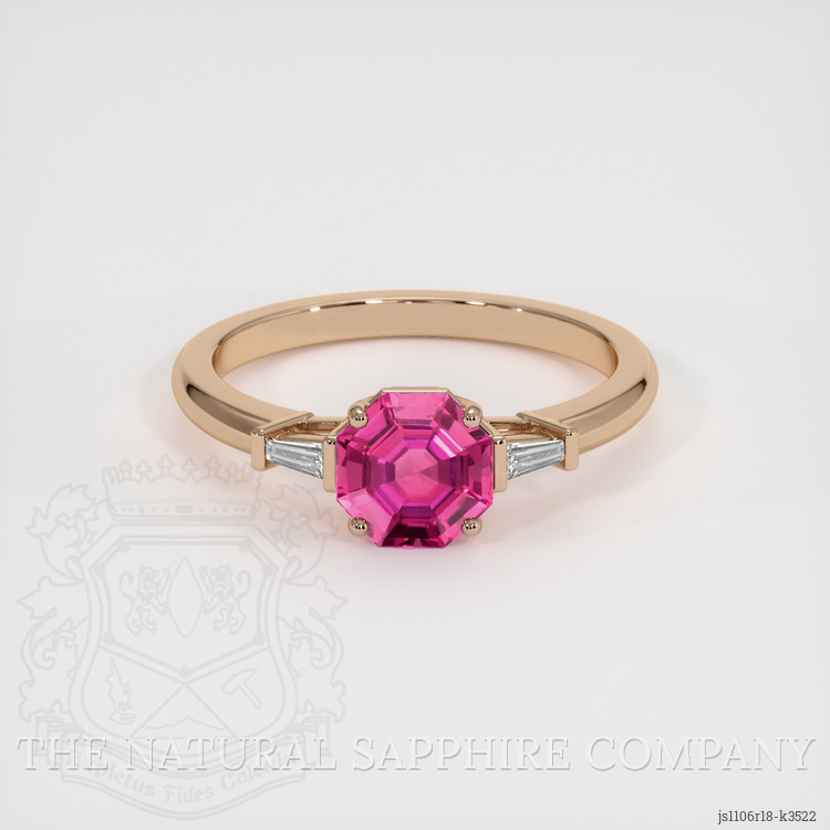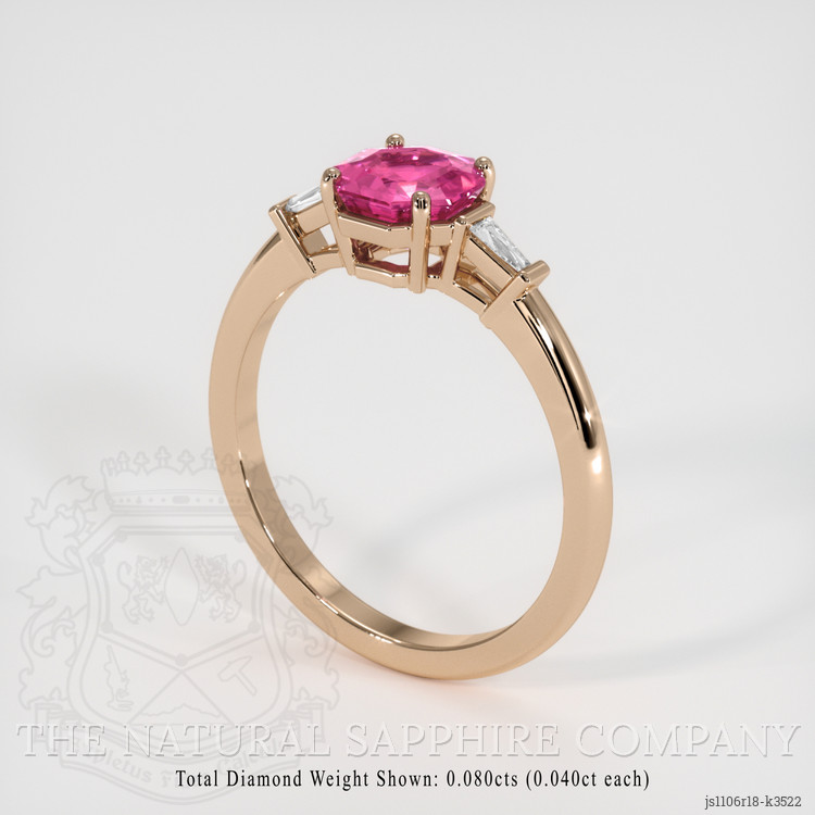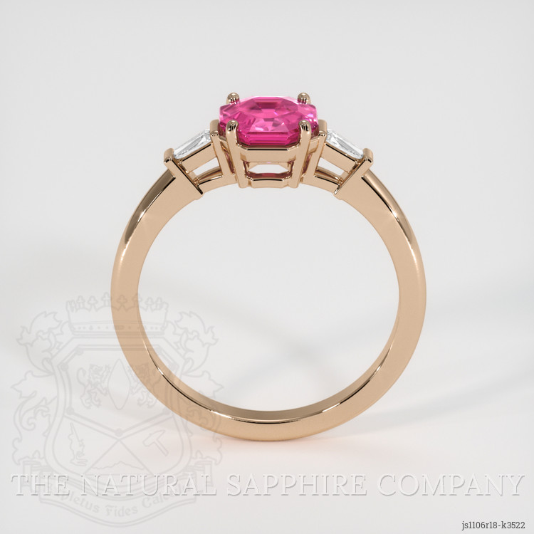 The ring features a beautiful, transparent 0.81 carat fancy shape pinkish red rubellitetourmaline with the dimensions of 6.42 x 6.41 x 3.70 mm and a step cut. It has a clarity grade of very slightly included (evaluated at eye level), intense color saturation, and an excellent polish. The origin of this rubellitetourmaline is Brazil.