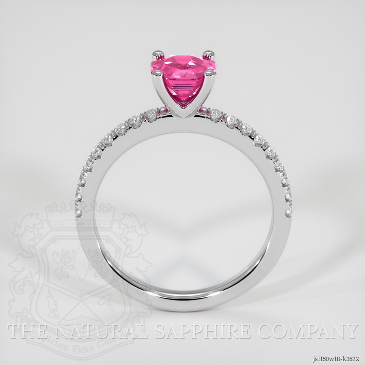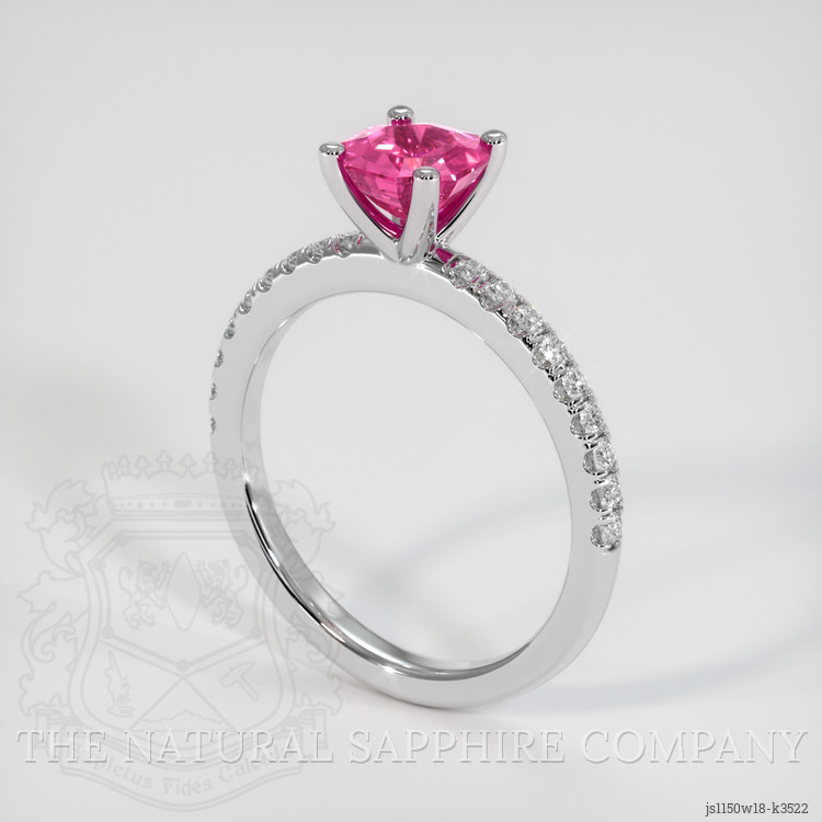 The ring features a beautiful, transparent 0.81 carat fancy shape pinkish red rubellitetourmaline with the dimensions of 6.42 x 6.41 x 3.70 mm and a step cut. It has a clarity grade of very slightly included (evaluated at eye level), intense color saturation, and an excellent polish. The origin of this rubellitetourmaline is Brazil.