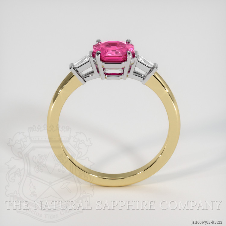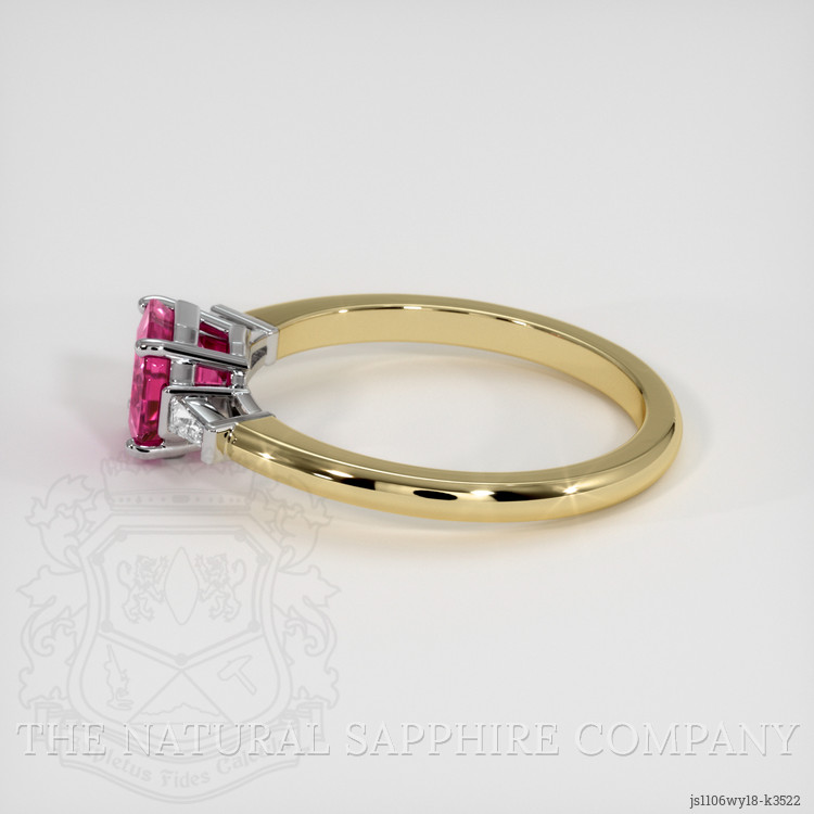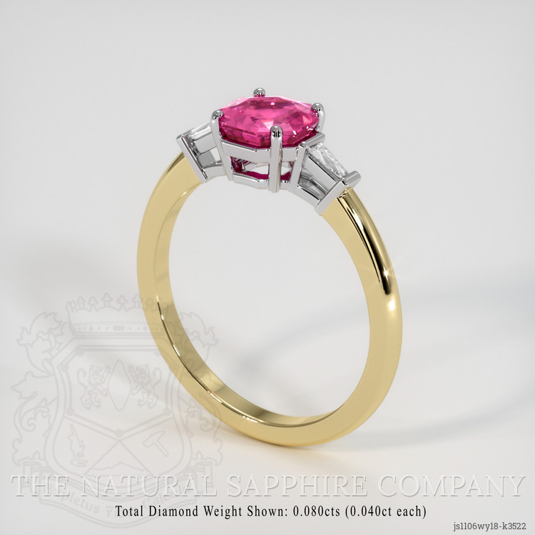 The ring features a beautiful, transparent 0.81 carat fancy shape pinkish red rubellitetourmaline with the dimensions of 6.42 x 6.41 x 3.70 mm and a step cut. It has a clarity grade of very slightly included (evaluated at eye level), intense color saturation, and an excellent polish. The origin of this rubellitetourmaline is Brazil.