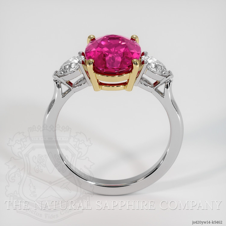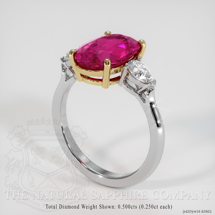 The finished gemstone measures a graceful 12.16 x 8.14 x 5.03 mm, weighing a substantial 3.20 carats. Complementing this central gem's allure, two pear-shaped diamonds, each weighing approximately 0.50 carats, elegantly flank the rubellite tourmaline. These diamonds boast a clarity grade of Very Slightly Included (VS1, VS2), and a pristine color grade of G, enhancing the rubellite's vibrant hue with their subtle, frosty brilliance.