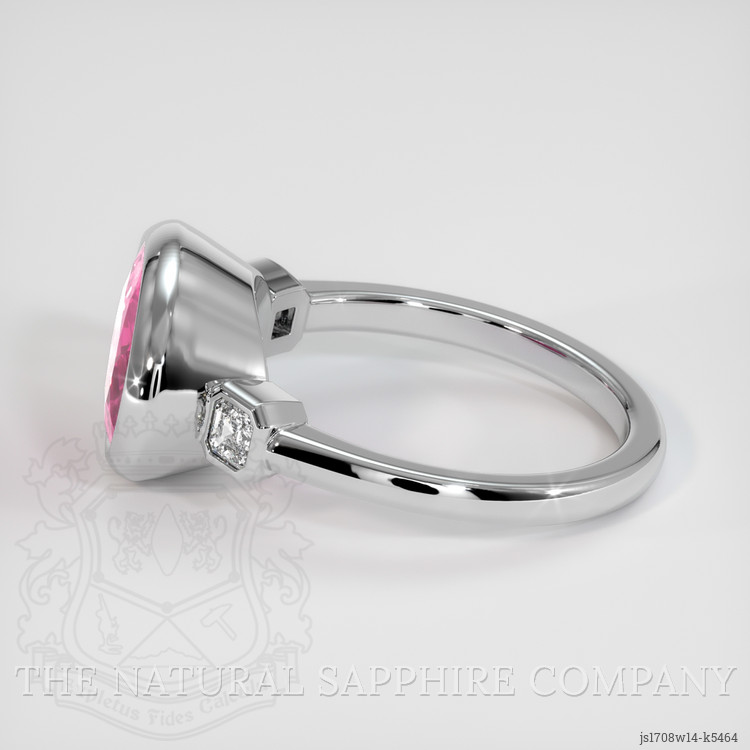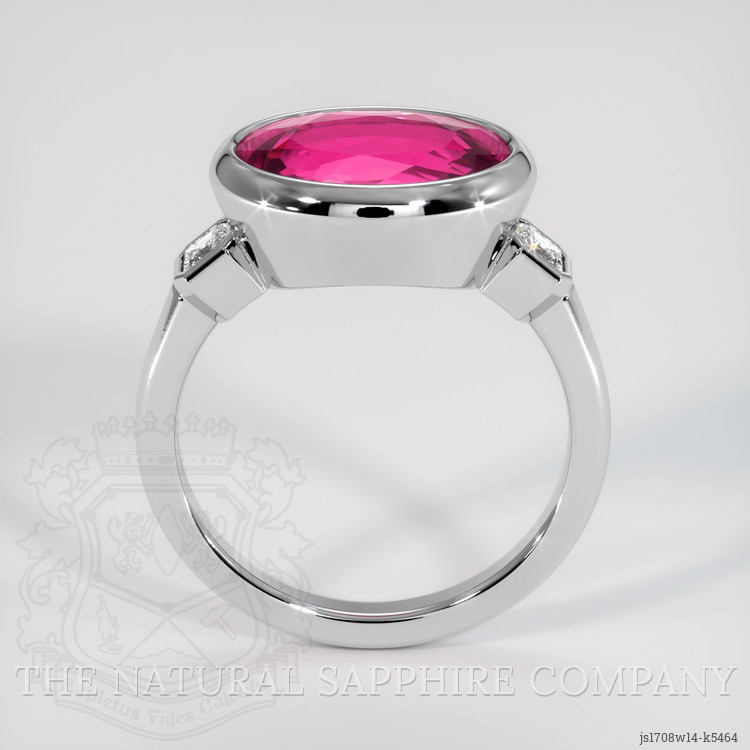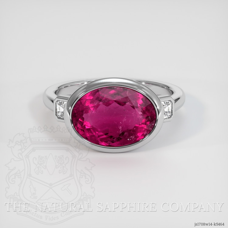 The ring features a beautiful, transparent 3.99 carat oval shape pinkish red rubellite tourmaline with dimensions of 11.99 x 8.76 x 5.17 mm and a mixed brilliant cut. It has a clarity grade of slightly included (evaluated at eye level), intense color saturation, and an excellent polish. The origin of this rubellite tourmaline is Mozambique.