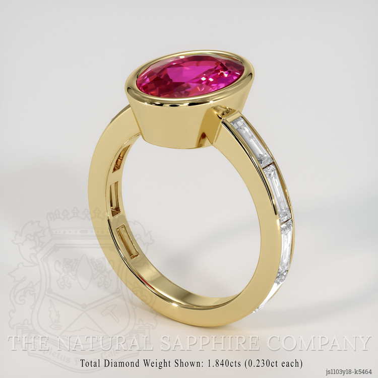 Complementing the rubellite’s vivid charm are meticulously selected white baguette-shaped natural diamonds, perfectly aligned on the band. Contributing approximately 1.84 carats to the ring, these diamonds are esteemed for their Very Slightly Included (VS1, VS2) clarity and exceptional F color grade. The immaculate craftsmanship ensures that each diamond intricately embellishes the setting, thus elevating the overall brilliance and sophistication of the piece.