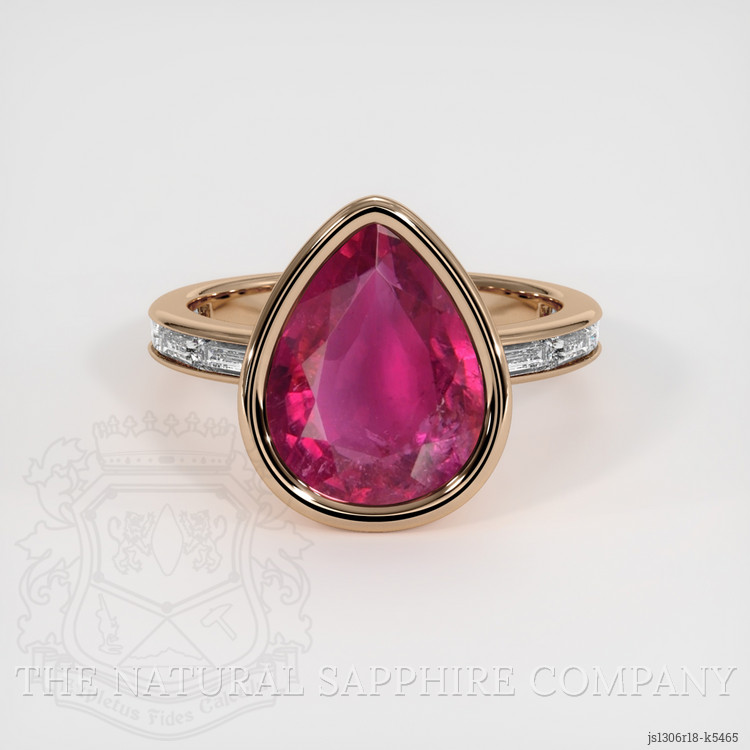 The ring features a beautiful, transparent 4.60 carat pear shape pinkish red rubellite tourmaline with dimensions of 12.46 x 9.53 x 6.02 mm and a mixed brilliant cut. The gemstone has a clarity grade of slightly included (evaluated at eye level), intense color saturation, and an excellent polish. The origin of this rubellite tourmaline is Mozambique. The intense color saturation highlights its rarity and enhances its appeal to educated buyers, ensuring a highly valuable acquisition. Additionally, the ring includes white baguette (straight) shaped diamonds, weighing approximately 0.64 carats, with a clarity grade of Very Slightly Included (VS1, VS2) and a color grade of E. These diamonds add further sophistication and allure to the piece. The rigidity and endurance of the band are assured by the meticulous construction using 18K rose gold. Known for its durability and longevity, the 18K rose gold ensures that the ring is perfect for long-term wear. This combination of high-quality materials and expert craftsmanship makes the ring not only visually stunning but also a durable and valuable addition to any fine jewelry collection. The detailed design and high standards of grading and clarity offer a trusted and reassuring buy for those who are well-versed in fine jewelry.