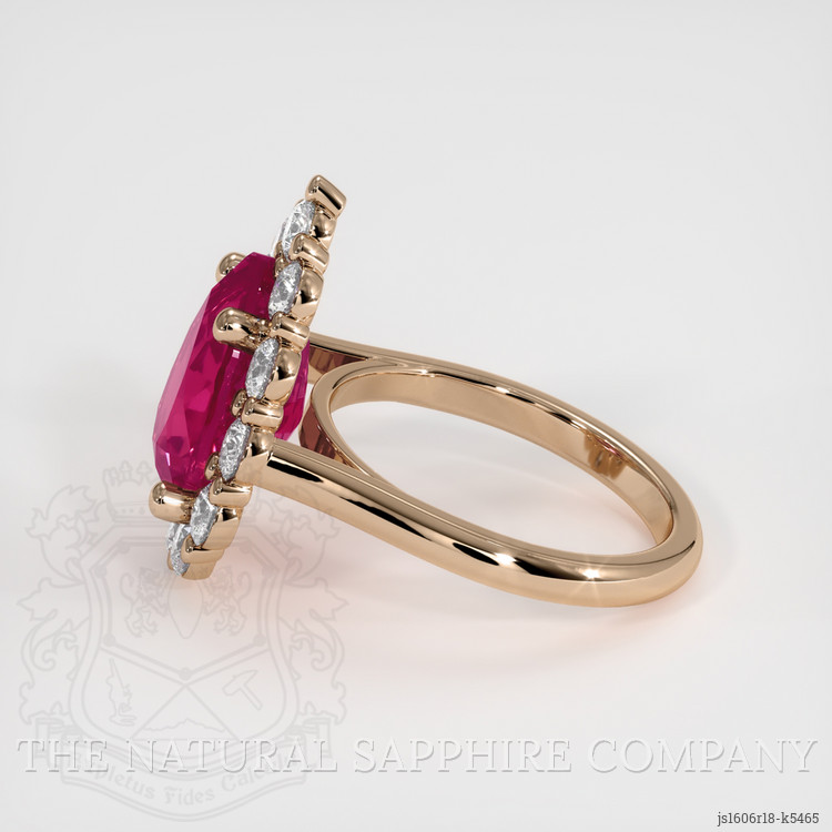 This exquisite ring features a stunning, transparent 4.60 carat pear-shaped pinkish-red rubellite tourmaline with the dimensions of 12.46 x 9.53 x 6.02 mm and a mixed brilliant cut. This rubellite tourmaline, originating from Mozambique, boasts a clarity grade of slightly included (evaluated at eye level), intense color saturation, and an excellent polish. The ring also includes white round-shaped diamonds, weighing approximately 1.44 carats, with a clarity grade of Very Slightly Included (VS1, VS2) and a color grade of E. The entire ring is set in 18K rose gold, ensuring a luxurious and elegant look.