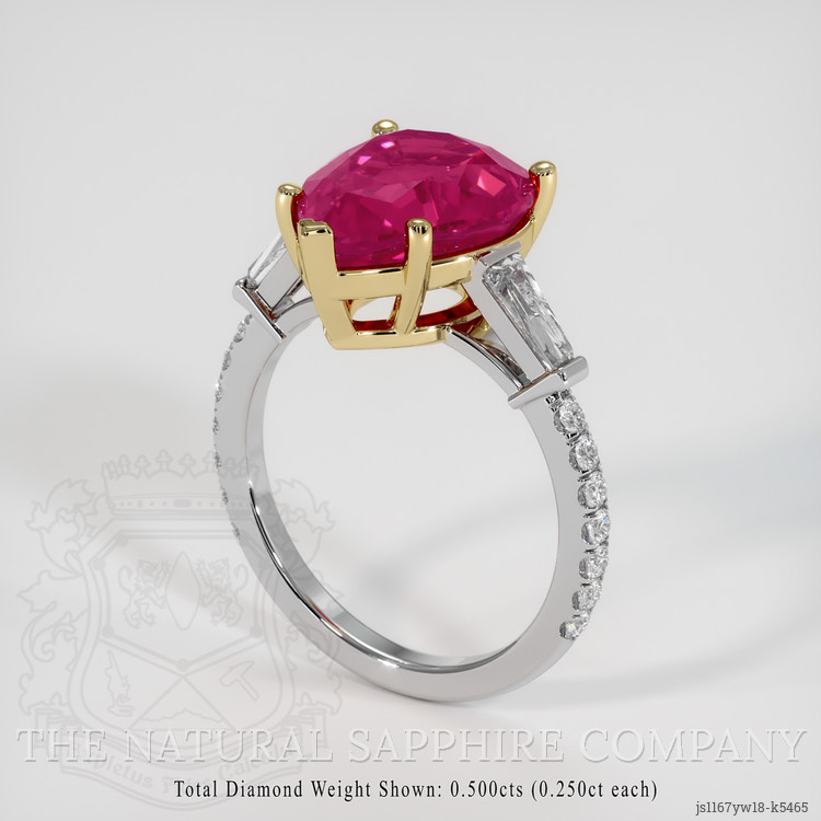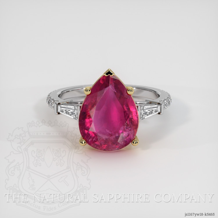 At the heart of the ring is a stunning 4.60 carat pear-shaped pinkish-red rubellitetourmaline. This gemstone, measuring 12.46 x 9.53 x 6.02 mm, boasts a mixed brilliant cut that captures and reflects light beautifully. Its clarity grade is slightly included when evaluated at eye level, adding character and uniqueness to the stone. With intense color saturation and an excellent polish, this gemstone is truly one of a kind. Originating from Mozambique, this rubellitetourmaline is a testament to nature's artistry.