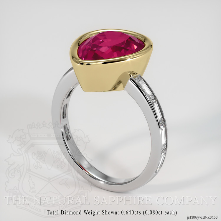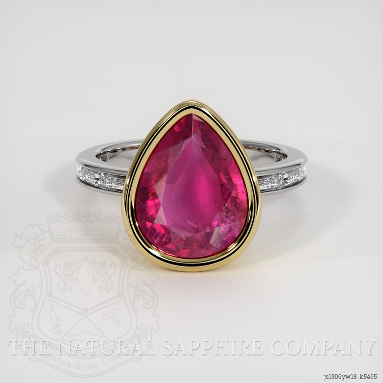 The ring features a beautiful, transparent 4.60 carat pear shape pinkish red rubellite tourmaline with the dimensions of 12.46 x 9.53 x 6.02 mm and a mixed brilliant cut. It has a clarity grade of slightly included (evaluated at eye level), intense color saturation, and an excellent polish. The origin of this rubellite tourmaline is Mozambique. Also featured in the ring are white baguette (straight) shaped diamonds, weighing approximately 0.64 carats, with a clarity grade of Very Slightly Included (VS1, VS2) and a color grade of E. The ring is entirely set in 18K yellow gold and 18K white gold. The rich history and timeless nature of the gemstone and design reflect a piece that appeals to those who value tradition and legacy. Rubellite tourmalines, known for their vibrant and striking colors, have been cherished throughout history for their beauty and significance. This particular gemstone was ethically sourced from Mozambique, a region renowned for its high-quality gem material. Every element of this ring has been crafted with careful attention to ethical sourcing and sustainability, ensuring that the beauty of the gemstone is matched by the integrity of its origins. The 18K yellow gold and 18K white gold used in the setting are a testament to the classic design and enduring quality of the piece.
