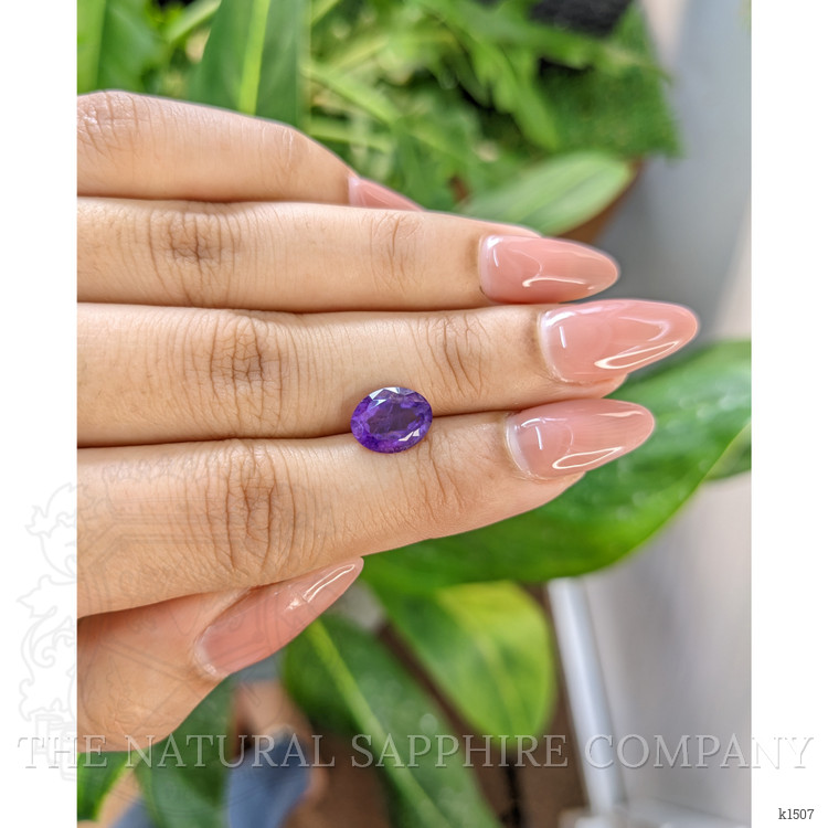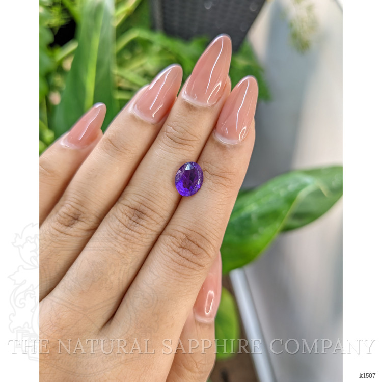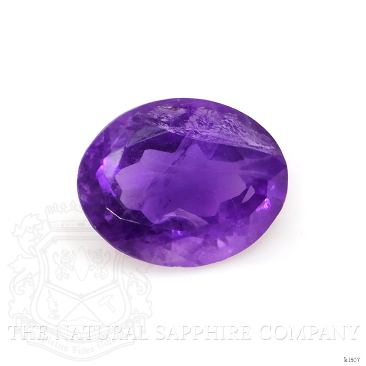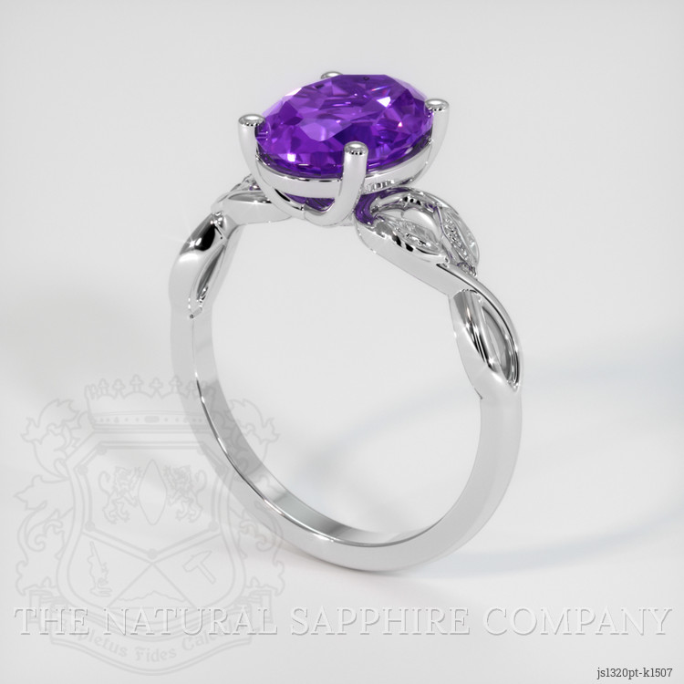 The ring features a beautiful, transparent 1.97 carat oval shape purple amethyst with the dimensions of 9.74 x 7.68 x 4.84 mm and a mixed brilliant cut. It has a clarity grade of included (evaluated at eye level), intense color saturation, and an excellent polish. The origin of this amethyst is Brazil.