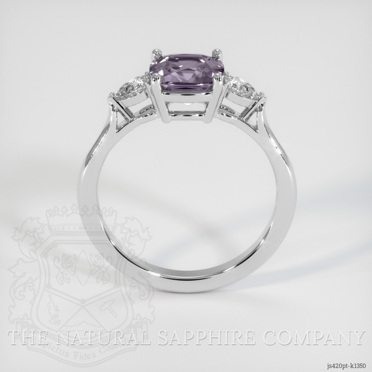 The ring features a beautiful, transparent 1.52 carat cushion shape purple spinel with the dimensions of 6.90 x 6.86 x 4.44 mm and a mixed brilliant cut. It has a clarity grade of very slightly included (evaluated at eye level), medium intense color saturation, and an excellent polish. The origin of this spinel is Tanzania.