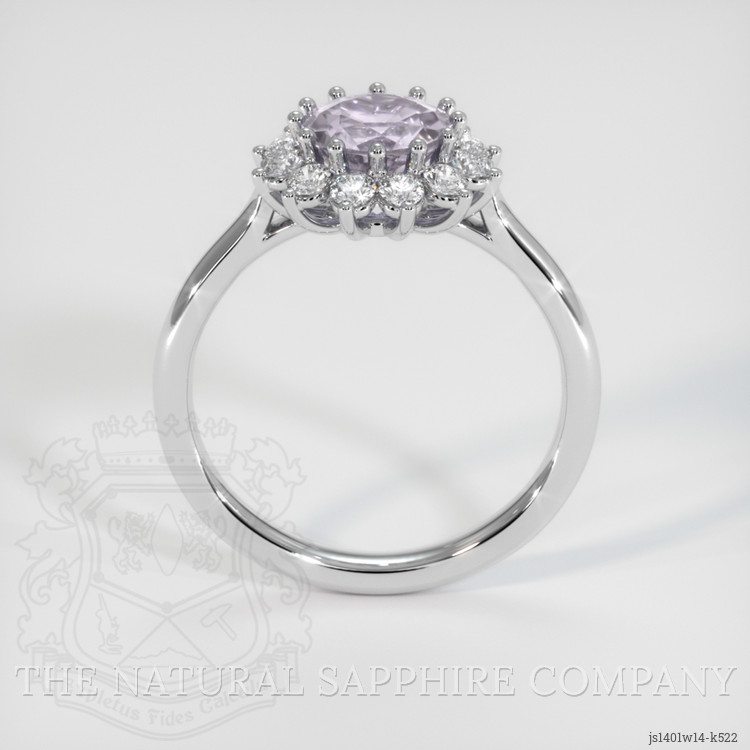 The ring features a beautiful, transparent 1.29 carat round shape purple spinel with the dimensions of 6.64 x 6.65 x 4.61 mm and a mixed brilliant cut. It has a clarity grade of eye clean (evaluated at eye level), very light color saturation, and an excellent polish. The origin of this spinel is Tanzania.