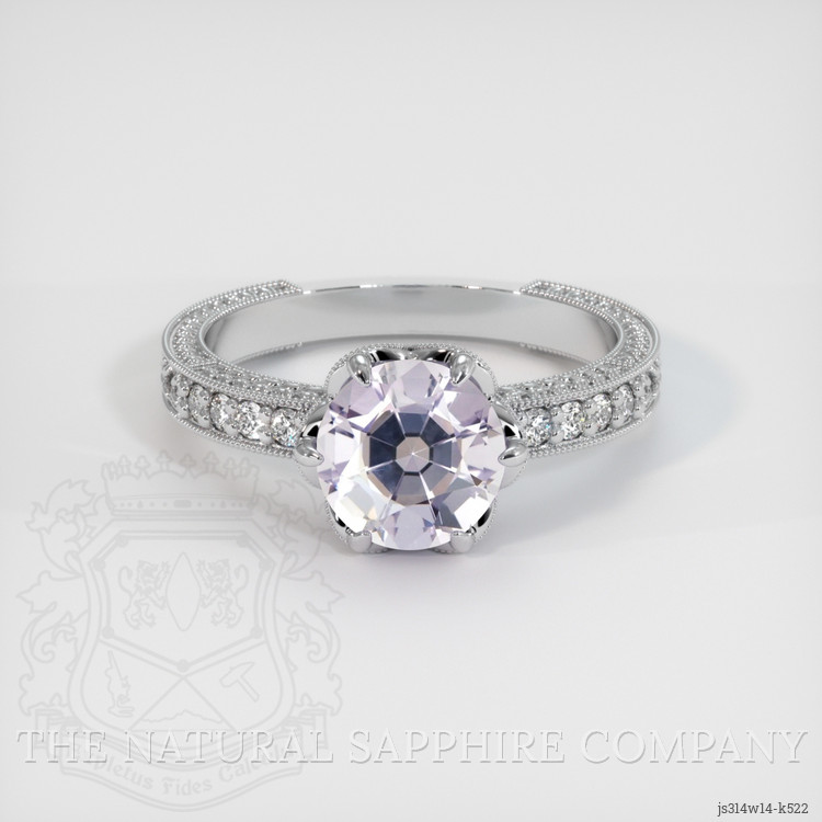 The ring features a beautiful, transparent 1.29 carat round shape purple spinel with the dimensions of 6.64 x 6.65 x 4.61 mm and a mixed brilliant cut. It has a clarity grade of eye clean (evaluated at eye level), very light color saturation, and an excellent polish. The origin of this spinel is Tanzania.