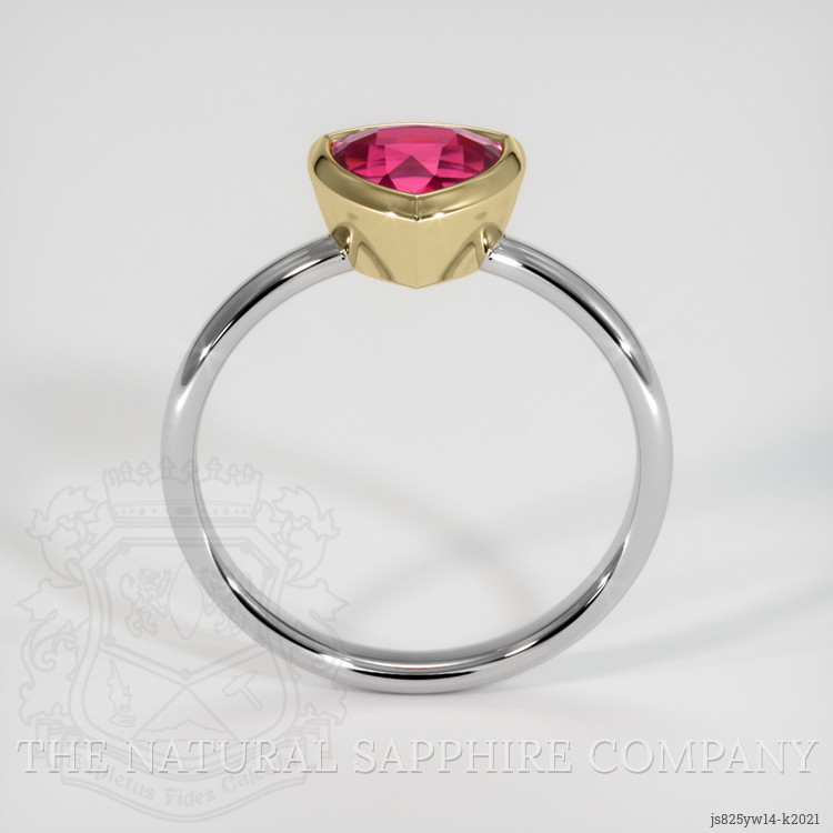 The men's ring features a beautiful, transparent 1.24 carat trillion shape purple tourmaline with the dimensions of 6.84 x 6.91 x 4.55 mm and a trillion cut. It has a clarity grade of slightly included (evaluated at eye level), intense color saturation, and an excellent polish. The origin of this tourmaline is Mozambique.