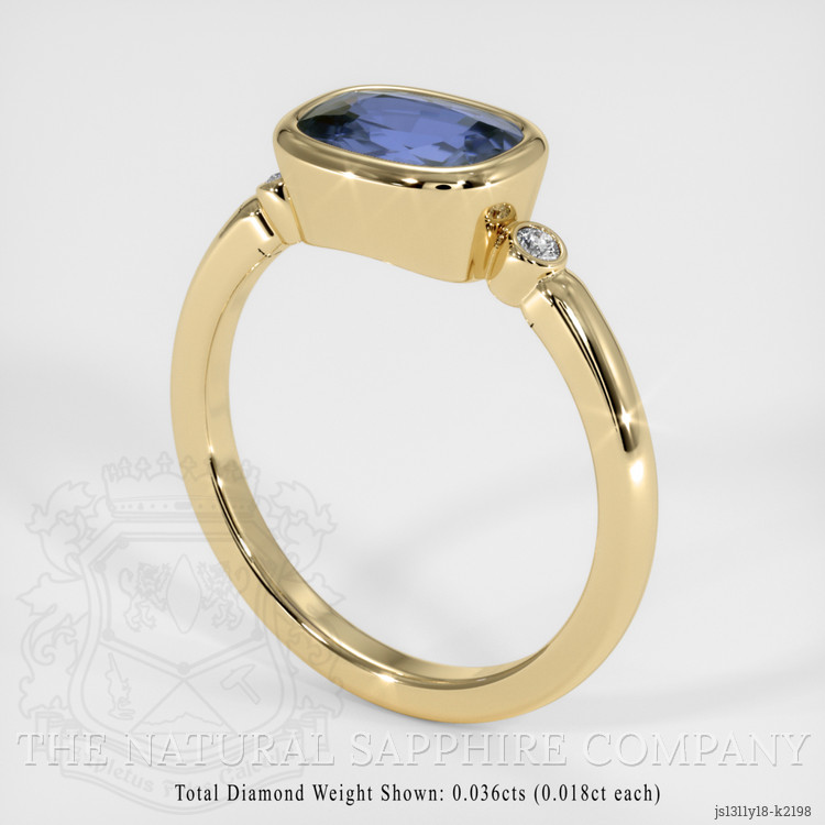 The ring features a beautiful, transparent 1.76 carat cushion shape purplish blue cobaltspinel with the dimensions of 8.17 x 6.24 x 3.85 mm and a mixed brilliant cut. It has a clarity grade of very slightly included (evaluated at eye level), medium intense color saturation, and an excellent polish. The origin of this cobaltspinel is Ceylon (Srilanka).