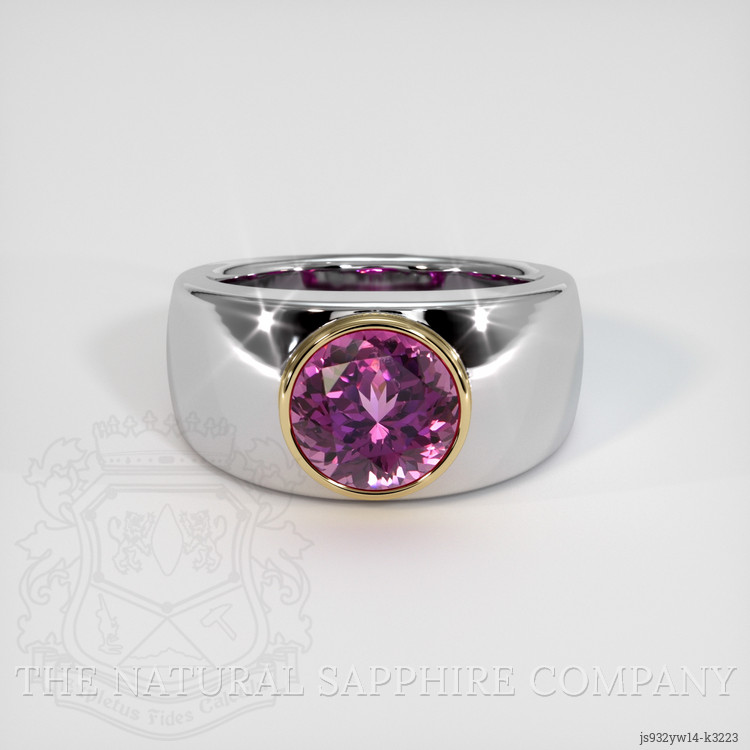 The men's ring features a beautiful, transparent 2.97 carat round shape purplish pink spinel with the dimensions of 8.57 x 8.57 x 5.96 mm and a mixed brilliant cut. It has a clarity grade of very slightly included (evaluated at eye level), intense color saturation, and an excellent polish. The origin of this spinel is Ceylon (Sri Lanka).