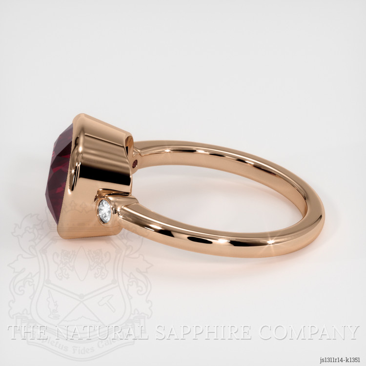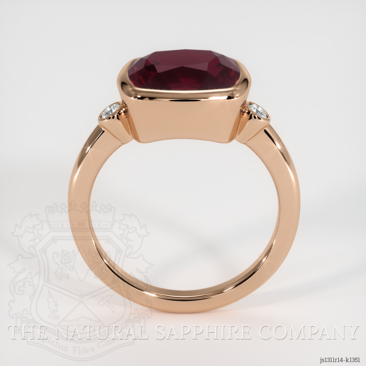 The ring features a beautiful, transparent 3.89 carat cushion shape purplish red rhodolitegarnet with the dimensions of 10.00 x 7.97 x 5.94 mm and a mixed brilliant cut. It has a clarity grade of very slightly included (evaluated at eye level), intense color saturation, and an excellent polish. The origin of this rhodolitegarnet is Madagascar.