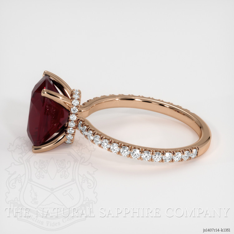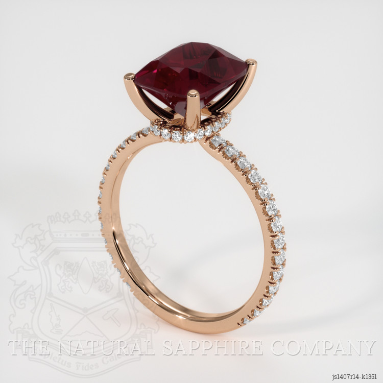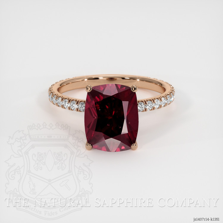The ring features a beautiful, transparent 3.89 carat cushion shape purplish red rhodolitegarnet with the dimensions of 10.00 x 7.97 x 5.94 mm and a mixed brilliant cut. It has a clarity grade of very slightly included (evaluated at eye level), intense color saturation, and an excellent polish. The origin of this rhodolitegarnet is Madagascar.