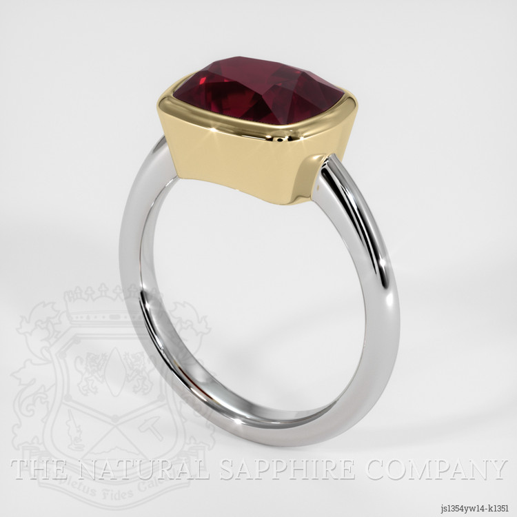 The men's ring features a beautiful, transparent 3.89 carat cushion shape purplish red rhodolitegarnet with the dimensions of 10.00 x 7.97 x 5.94 mm and a mixed brilliant cut. It has a clarity grade of very slightly included (evaluated at eye level), intense color saturation, and an excellent polish. The origin of this rhodolitegarnet is Madagascar.