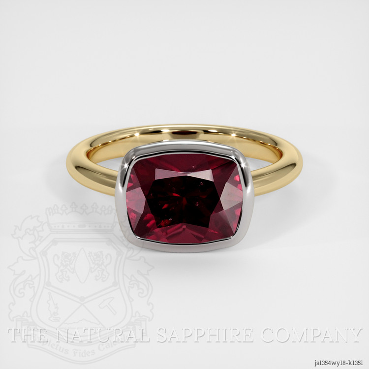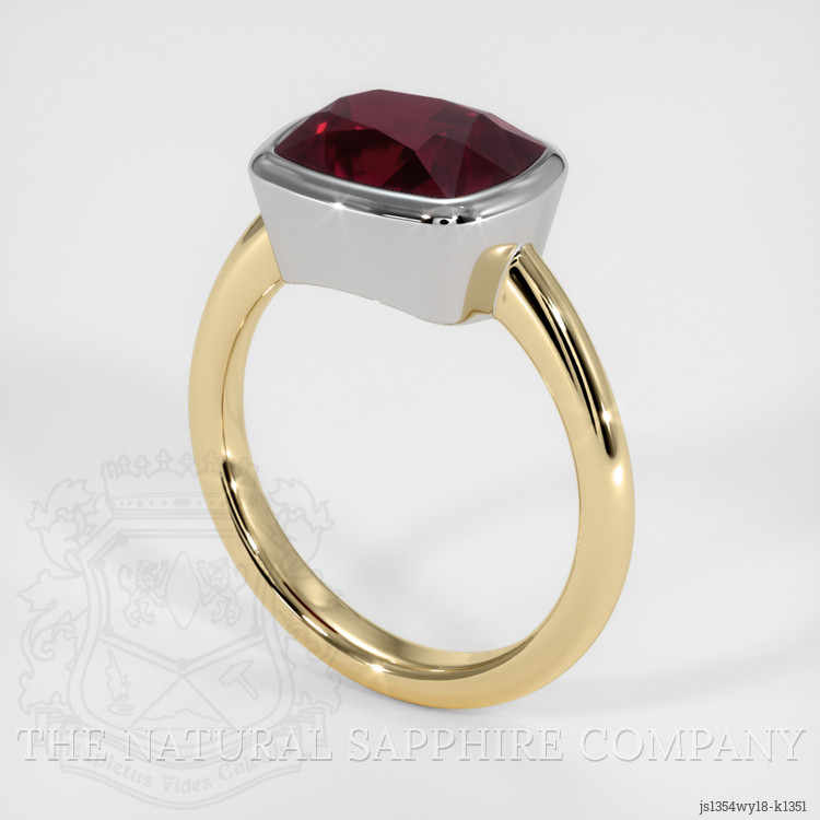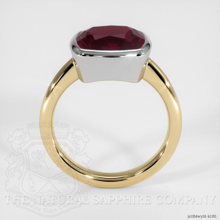 The men's ring features a beautiful, transparent 3.89 carat cushion shape purplish red rhodolitegarnet with the dimensions of 10.00 x 7.97 x 5.94 mm and a mixed brilliant cut. It has a clarity grade of very slightly included (evaluated at eye level), intense color saturation, and an excellent polish. The origin of this rhodolitegarnet is Madagascar.