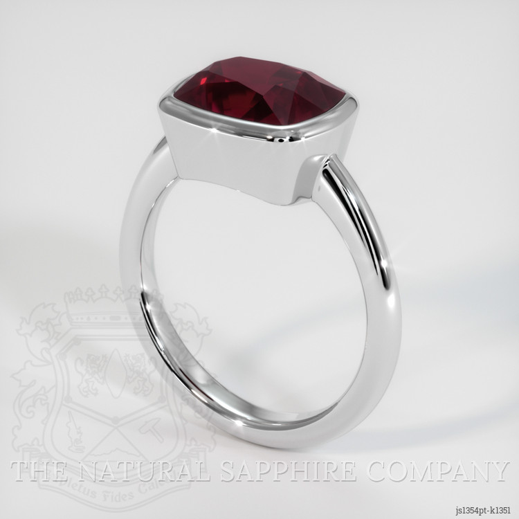 The men's ring features a beautiful, transparent 3.89 carat cushion shape purplish red rhodolitegarnet with the dimensions of 10.00 x 7.97 x 5.94 mm and a mixed brilliant cut. It has a clarity grade of very slightly included (evaluated at eye level), intense color saturation, and an excellent polish. The origin of this rhodolitegarnet is Madagascar.