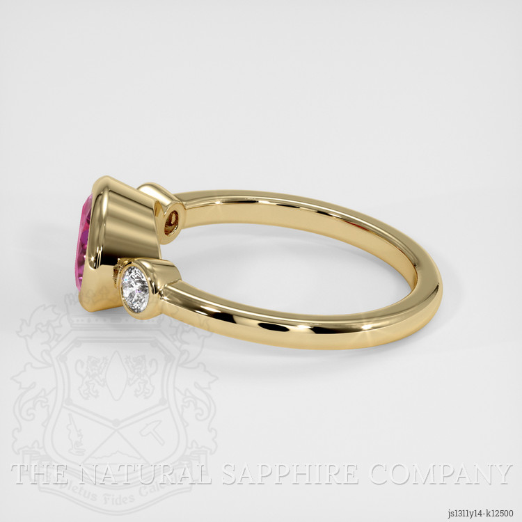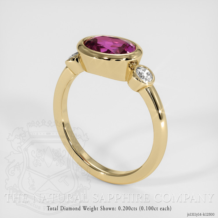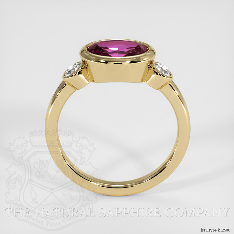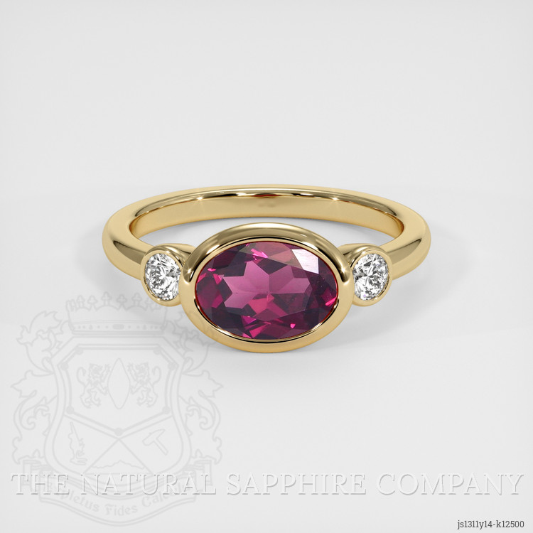 Framing the rhodolite, two white round natural diamonds together weighing approximately 0.20 carats provide a whisper of icy contrast that lifts and refines the central stone. Their Very Slightly Included clarity grades of VS1, VS2 and their crisp E color mean these diamonds are a pure white foil, offering lively sparkle and fire without distracting from the garnet, instead harmonizing to heighten the overall composition. The entire ensemble is set in warm 14 karat yellow gold, a metal choice selected to echo and enhance the rhodolite's warm purplish red tones, while lending the piece an enduring presence and an heirloom quality. This ring from The Natural Gemstone Company is a rare convergence of natural beauty, exacting craftsmanship, and considered design, a jewel that reads as achievement and refined expression. To wear it is to declare a refined sensibility, to possess a luminous story, and to invest in an enduring object of desire.