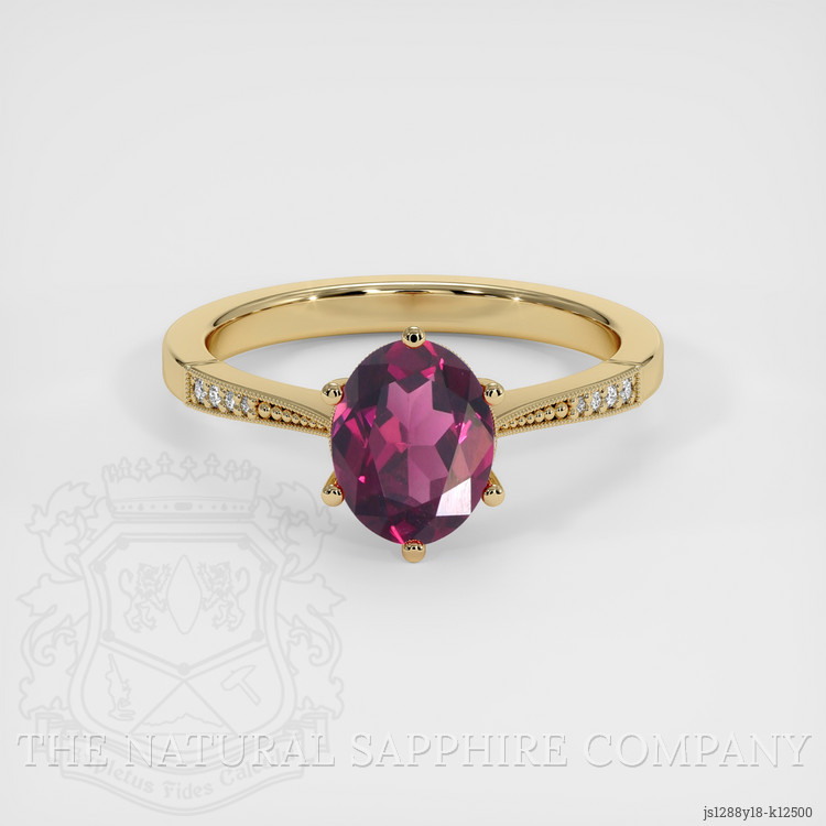 The design is thoughtful down to every curve and facet, the oval shape flattering the finger by creating an elongated, elegant silhouette that flatters any hand. The center stone is held by secure prongs that lift the garnet to catch light from every angle, while delicate white round natural diamonds accent the shoulders to add a halo of twinkling punctuation along the band. The diamonds range in weight and scale to provide a model of balanced sparkle, including rounds of approximately 0.015 carats, 0.03 carats, and 0.027 carats, each with clarity graded VS and color graded F slash G, chosen to complement the rhodolite without competing with it. The entire setting is crafted in warm 14K yellow gold, a metal that amplifies the garnet s purplish red tones and adds a timeless, luxurious warmth that pairs beautifully with both cool and warm palettes.