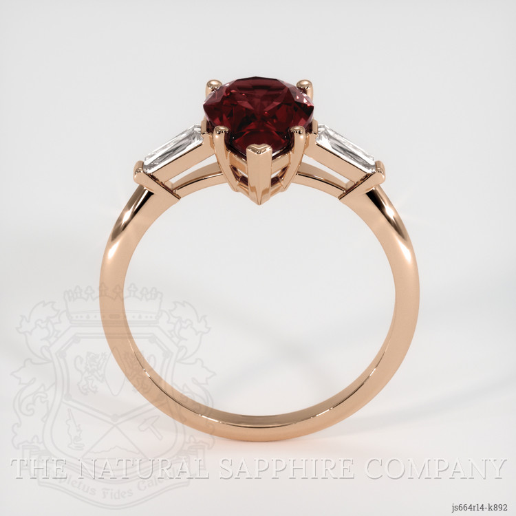 The ring features a beautiful, transparent 2.18 carat pear shape purplish red rhodolitegarnet with the dimensions of 11.25 x 6.67 x 4.14 mm and a mixed brilliant cut. It has a clarity grade of very slightly included (evaluated at eye level), vivid color saturation, and an excellent polish. The origin of this rhodolitegarnet is Tanzania.