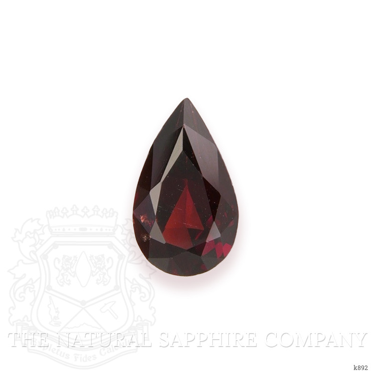 The ring features a beautiful, transparent 2.18 carat pear shape purplish red rhodolitegarnet with the dimensions of 11.25 x 6.67 x 4.14 mm and a mixed brilliant cut. It has a clarity grade of very slightly included (evaluated at eye level), vivid color saturation, and an excellent polish. The origin of this rhodolitegarnet is Tanzania.