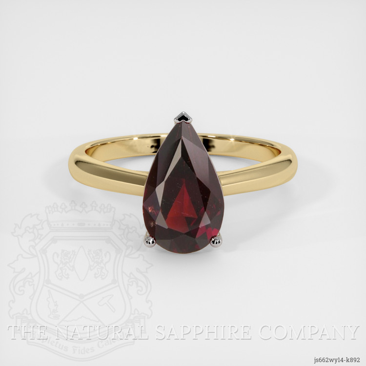 The ring features a beautiful, transparent 2.18 carat pear shape purplish red rhodolitegarnet with the dimensions of 11.25 x 6.67 x 4.14 mm and a mixed brilliant cut. It has a clarity grade of very slightly included (evaluated at eye level), vivid color saturation, and an excellent polish. The origin of this rhodolitegarnet is Tanzania.