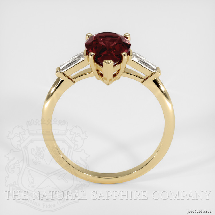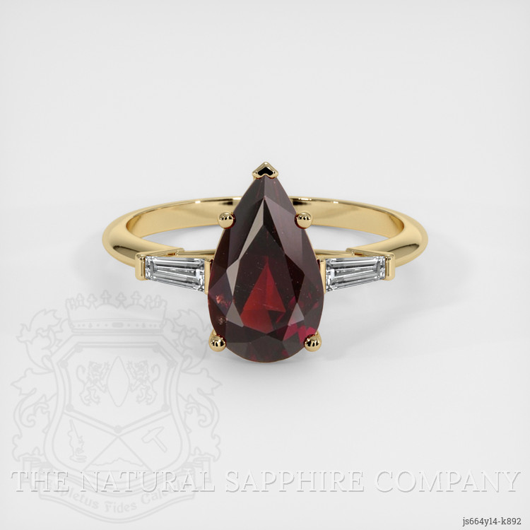 The ring features a beautiful, transparent 2.18 carat pear shape purplish red rhodolitegarnet with the dimensions of 11.25 x 6.67 x 4.14 mm and a mixed brilliant cut. It has a clarity grade of very slightly included (evaluated at eye level), vivid color saturation, and an excellent polish. The origin of this rhodolitegarnet is Tanzania.
