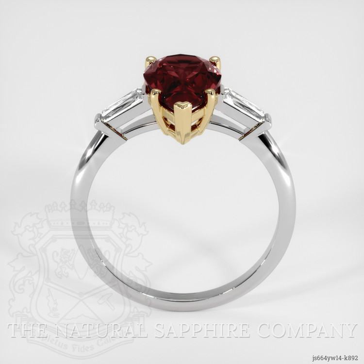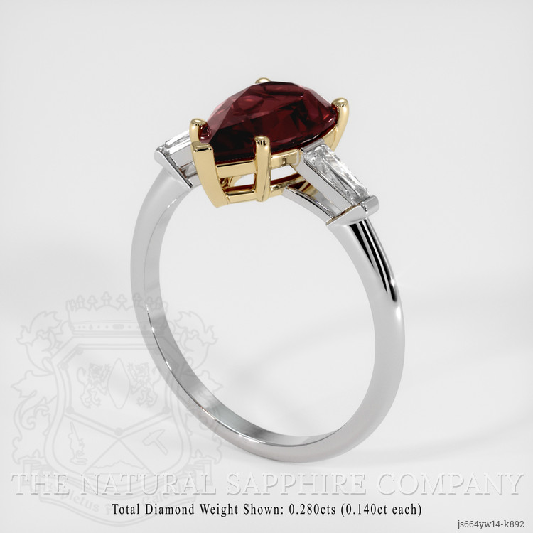 The ring features a beautiful, transparent 2.18 carat pear shape purplish red rhodolitegarnet with the dimensions of 11.25 x 6.67 x 4.14 mm and a mixed brilliant cut. It has a clarity grade of very slightly included (evaluated at eye level), vivid color saturation, and an excellent polish. The origin of this rhodolitegarnet is Tanzania.