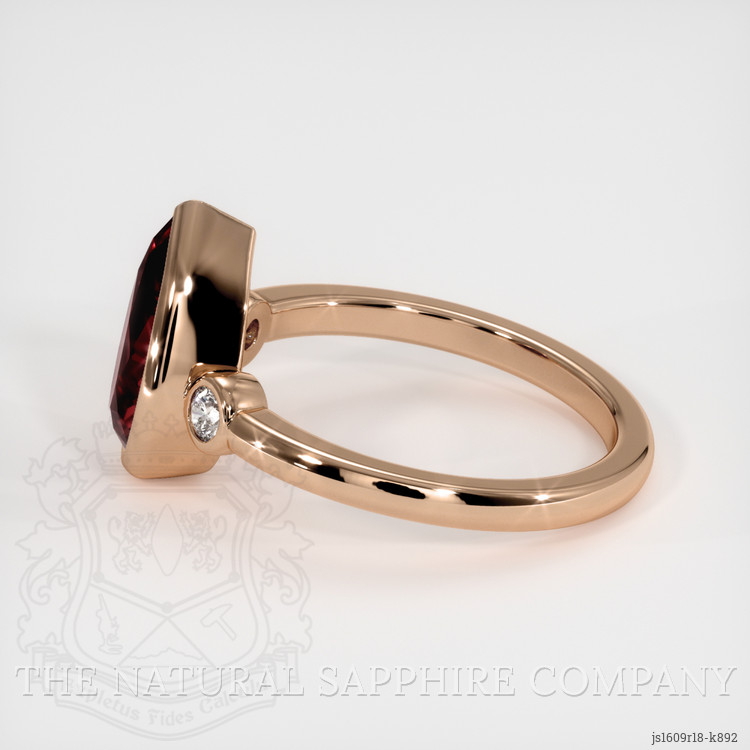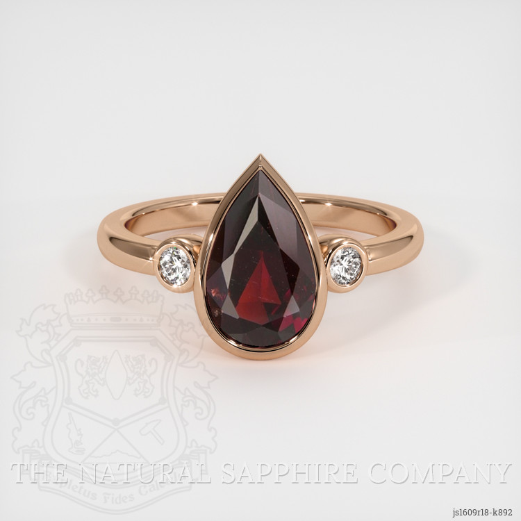 The ring features a beautiful, transparent 2.18 carat pear shape purplish red rhodolitegarnet with the dimensions of 11.25 x 6.67 x 4.14 mm and a mixed brilliant cut. It has a clarity grade of very slightly included (evaluated at eye level), vivid color saturation, and an excellent polish. The origin of this rhodolitegarnet is Tanzania.