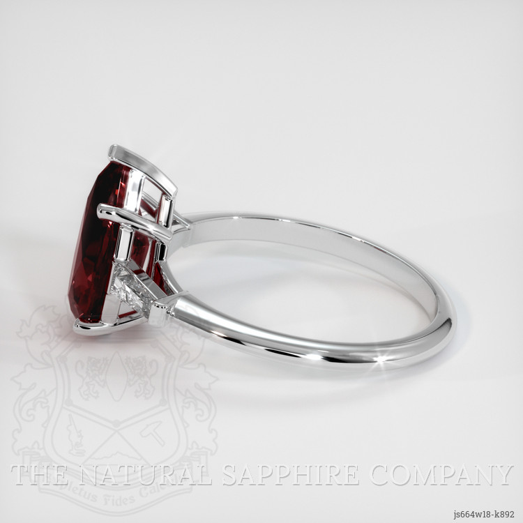 The ring features a beautiful, transparent 2.18 carat pear shape purplish red rhodolitegarnet with the dimensions of 11.25 x 6.67 x 4.14 mm and a mixed brilliant cut. It has a clarity grade of very slightly included (evaluated at eye level), vivid color saturation, and an excellent polish. The origin of this rhodolitegarnet is Tanzania.