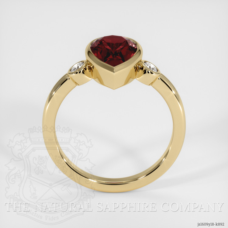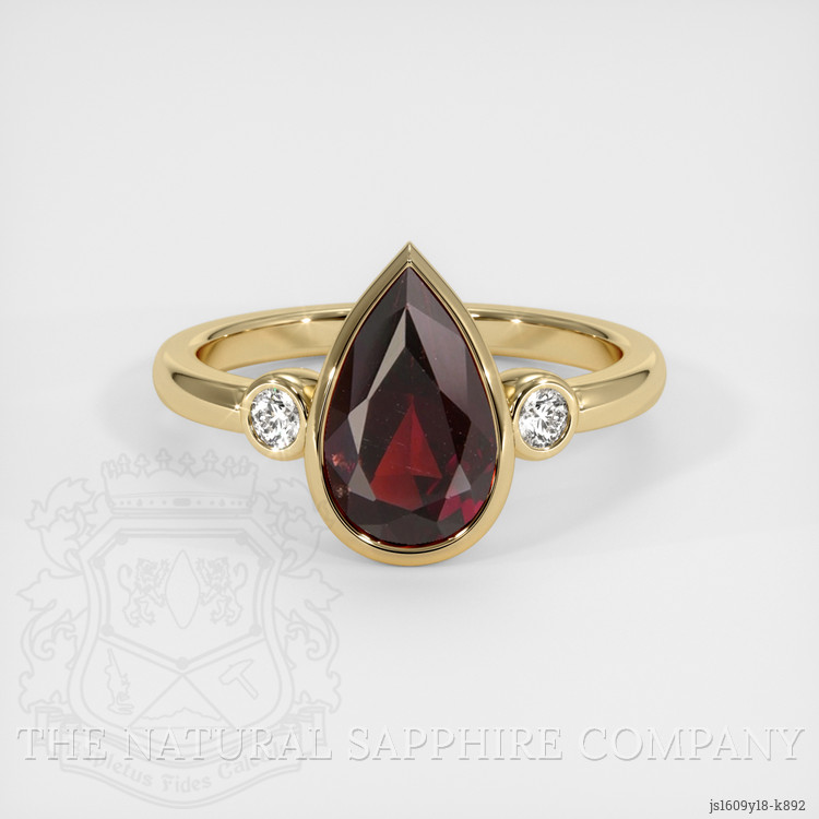 The ring features a beautiful, transparent 2.18 carat pear shape purplish red rhodolitegarnet with the dimensions of 11.25 x 6.67 x 4.14 mm and a mixed brilliant cut. It has a clarity grade of very slightly included (evaluated at eye level), vivid color saturation, and an excellent polish. The origin of this rhodolitegarnet is Tanzania.