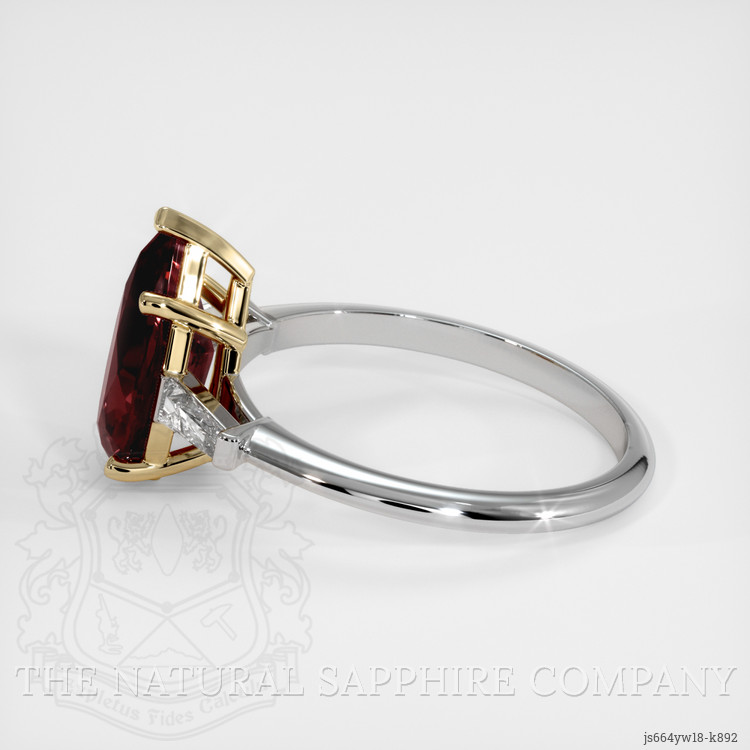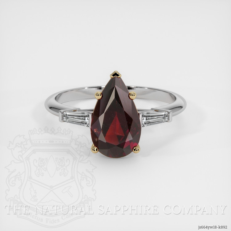 The ring features a beautiful, transparent 2.18 carat pear shape purplish red rhodolitegarnet with the dimensions of 11.25 x 6.67 x 4.14 mm and a mixed brilliant cut. It has a clarity grade of very slightly included (evaluated at eye level), vivid color saturation, and an excellent polish. The origin of this rhodolitegarnet is Tanzania.