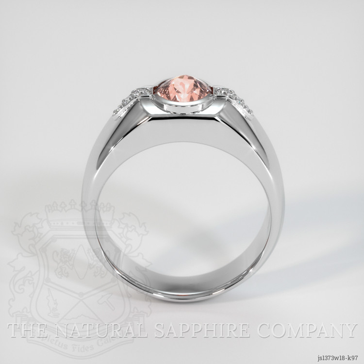Complementing this exquisite gemstone are bright white round diamonds, skillfully set within the 18K white gold band. With varying weights of 0.02, 0.015, and 0.01 carats, each diamond mirrors a precise level of quality, boasting a very slightly included clarity grade and a pristine F color grade. These attributes ensure that every diamond, while small, adds brilliance and a harmonic balance to the overall design. The superior polish ensures a finish that is both smooth and reflective, showcasing the expert craftsmanship invested in each detail of the ring.