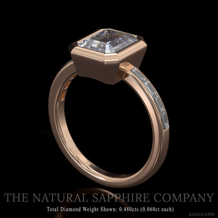 Also featured in the ring: White baguette (straight) shaped diamonds, weighing approx 0.48 carats, clarity Very Slightly Included (VS1, VS2) and a color grade of E.