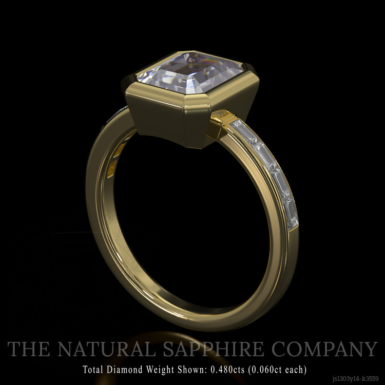 Also featured in the ring: White baguette (straight) shaped diamonds, weighing approx 0.48 carats, clarity Very Slightly Included (VS1, VS2) and a color grade of E.