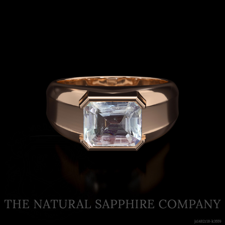 The men's ring features a beautiful, semi-transparent 2.00 carat emerald cut shape white moonstone with the dimensions of 8.20 x 7.12 x 4.99 mm and a emerald cut. It has a clarity grade of very slightly included (evaluated at eye level), colorless color saturation, and an excellent polish. The origin of this moonstone is Ceylon (Sri Lanka).
