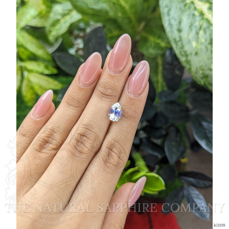 The Natural Gemstone Company proudly presents an exquisite ring, masterfully designed to encapsulate both elegance and durability. At its center lies a semi-transparent, 1.85-carat pear-shaped white moonstone, originating from the renowned gemstone mines of Madagascar. This moonstone, with dimensions measuring 10.34 x 6.99 x 5.24 mm, showcases a mixed brilliant cut that highlights its innate beauty. Evaluated at eye level, the moonstone holds a clarity grade of very slightly included, ensuring that it remains a captivating focal point. Its near-colorless saturation coupled with an excellent polish enhances its subtle glow, promising a timeless appeal that fits seamlessly with any ensemble.