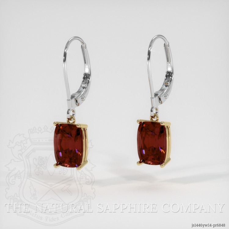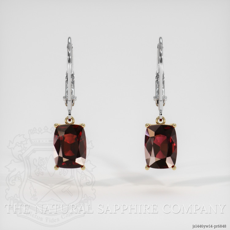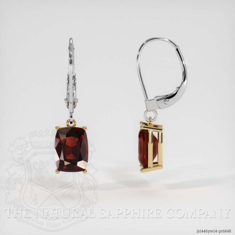 The earrings feature a beautiful, transparent pair of garnets that are 4.78 total carat weight. They are cushion shape red garnets, with the dimensions of 9.07 x 6.49 x 4.47 mm and are mixed brilliant cut, have a clarity grade of eye clean (evaluated at eye level), vivid color saturation, and an excellent polish. The origin of this pair of garnets is Ceylon (Sri Lanka).