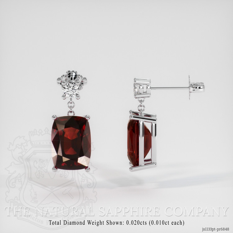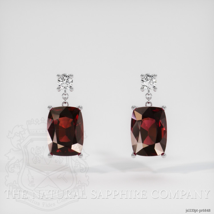 The earrings feature a beautiful, transparent pair of garnets that are 4.78 total carat weight. They are cushion shape red garnets, with the dimensions of 9.07 x 6.49 x 4.47 mm and are mixed brilliant cut, have a clarity grade of eye clean (evaluated at eye level), vivid color saturation, and an excellent polish. The origin of this pair of garnets is Ceylon (Sri Lanka).