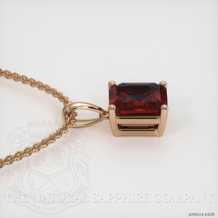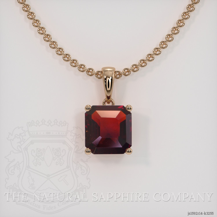 The pendant features a beautiful, transparent 1.52 carat asscher - octagon shape red garnet with the dimensions of 6.97 x 6.62 x 3.56 mm and a asscher cut. It has a clarity grade of very slightly included (evaluated at eye level), vivid color saturation, and an excellent polish. The origin of this garnet is Ceylon (Sri Lanka).