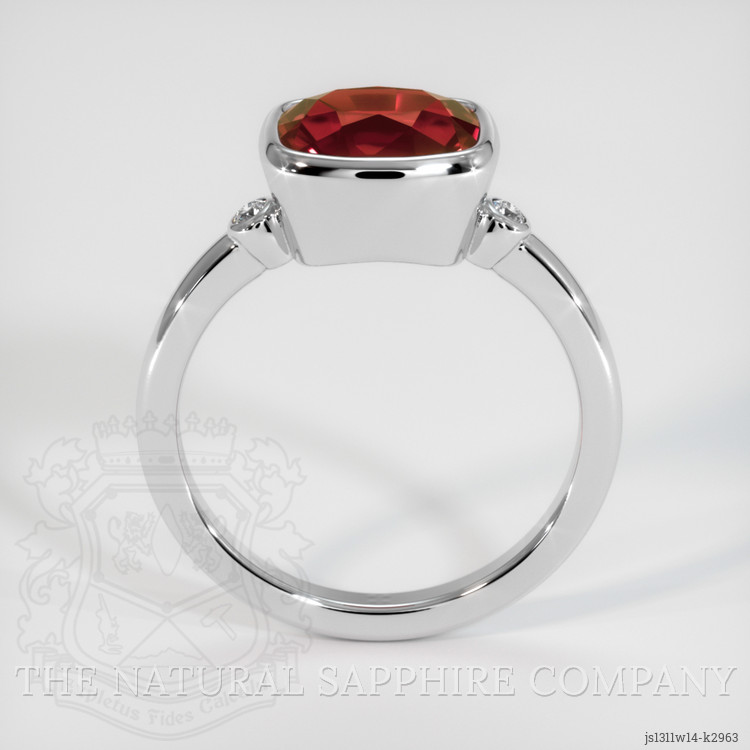 The ring features a beautiful, transparent GIA certified Red 2.94 carat cushion shape red garnet with the dimensions of 8.76 x 6.94 x 5.86 mm and a mixed brilliant cut. It has a clarity grade of very slightly included (evaluated at eye level), vivid color saturation, and an excellent polish. The origin of this garnet is Tanzania.