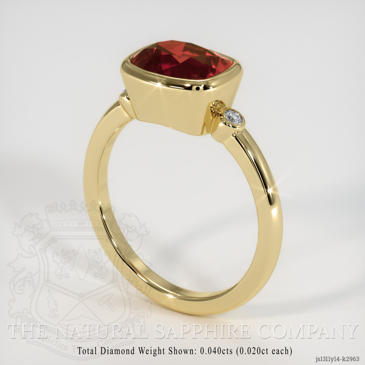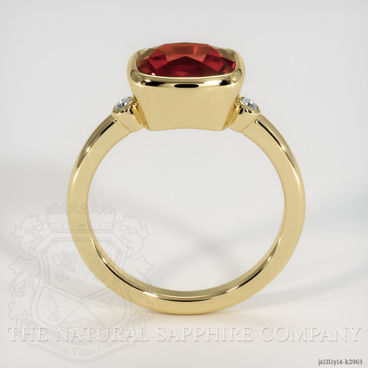 The ring features a beautiful, transparent GIA certified Red 2.94 carat cushion shape red garnet with the dimensions of 8.76 x 6.94 x 5.86 mm and a mixed brilliant cut. It has a clarity grade of very slightly included (evaluated at eye level), vivid color saturation, and an excellent polish. The origin of this garnet is Tanzania.