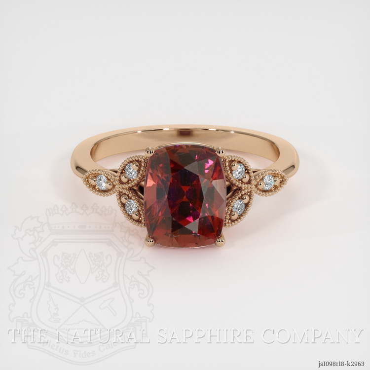 The ring features a beautiful, transparent GIA certified Red 2.94 carat cushion shape red garnet with the dimensions of 8.76 x 6.94 x 5.86 mm and a mixed brilliant cut. It has a clarity grade of very slightly included (evaluated at eye level), vivid color saturation, and an excellent polish. The origin of this garnet is Tanzania.