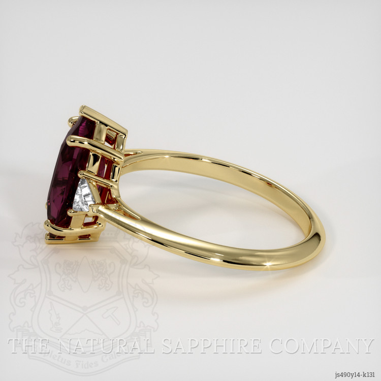 Flanking the central garnet are two natural white diamonds, cut in a trillion shape, together weighing approximately 0.24 carats, with clarity grades Very Slightly Included VS1 and VS2, and a color grade of E, which provides a high degree of colorless contrast against the garnet. The excellent clarity and E color of the diamonds enhance edge light and flash, creating a complementary halo of white light that frames the red center and reinforces overall brightness. The entire composition is set in 18K yellow gold, selected to warm the garnet hue and provide structural integrity, with a finely executed gallery and bezel clearance that allow light to enter from multiple angles. Craftsmanship emphasizes symmetry, secure setting junctions, and a smooth finish on the band that transitions to open work at the shoulders to reduce visual weight and increase perceived stone size. At The Natural Gemstone Company we present this piece as an engineered expression of devotion, where the mixed brilliant faceting and the diamond side stones work in concert to produce a persistent return of light. The continuous radiance of the garnet center symbolizes eternal love, each reflection representing enduring commitment, and the balanced proportions and durable gold mounting ensure that this symbolism is preserved through daily wear and across generations.