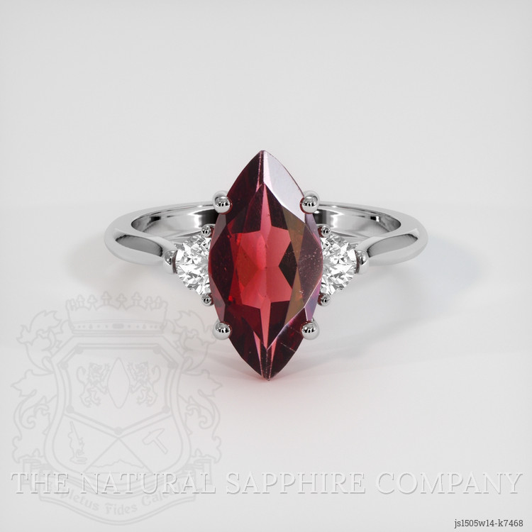 A statement of refined taste, this ring presents a 2.69 carat marquise red garnet, its elongated silhouette measuring 14.23 by 7.13 by 3.83 millimeters, cut in a mixed brilliant pattern to catch and return light with lively symmetry. The gem exhibits vivid color saturation and an excellent polish, clarity graded very slightly included as evaluated at eye level, and it carries the subtle enhancement of heat treatment, a standard refinement that deepens tone while preserving the stone character. This central garnet is flanked by white half moon shaped lab grown diamonds weighing approximately 0.30 carats in total, clarity graded Very Slightly Included with VS1 and VS2 distinctions, and a color grade of E for exceptional whiteness. The entire composition is set in 14K white gold, a cool and elegant canvas that amplifies the garnet red while allowing the half moons to whisper diamond fire at every turn. Offered by The Natural Gemstone Company, this ring is both an objet d art and a wearable emblem of distinction.